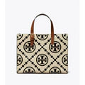 Cream and black ‘T Monogram Small’ shopper bag from Tory Burch. Crafted from monogrammed leather, this design features two half-round brown handles, gold-tone metal hardware and one internal compartment with three slip pockets and one zip pocket.